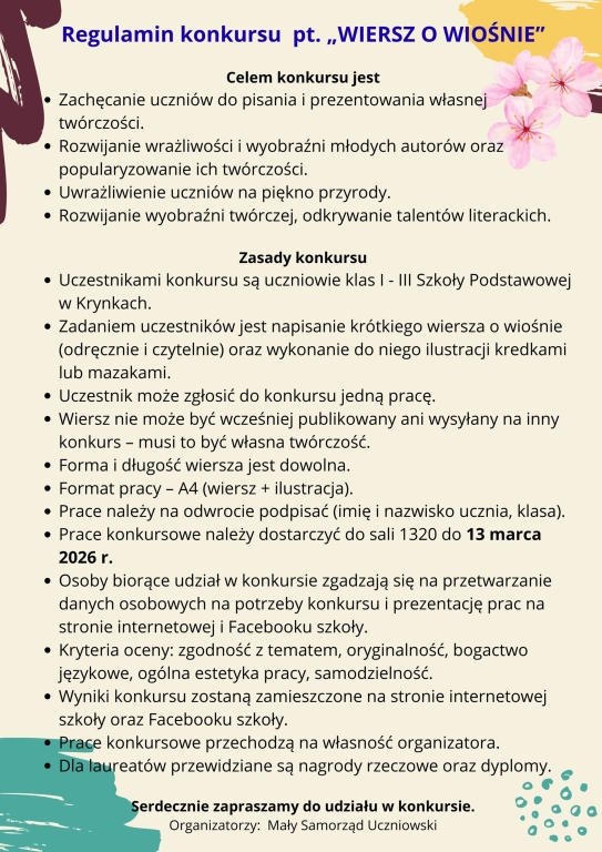 Regulamin konkursu pt. „WIERSZ O WIOŚNIE”