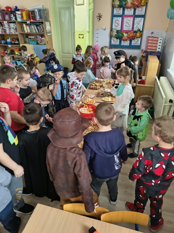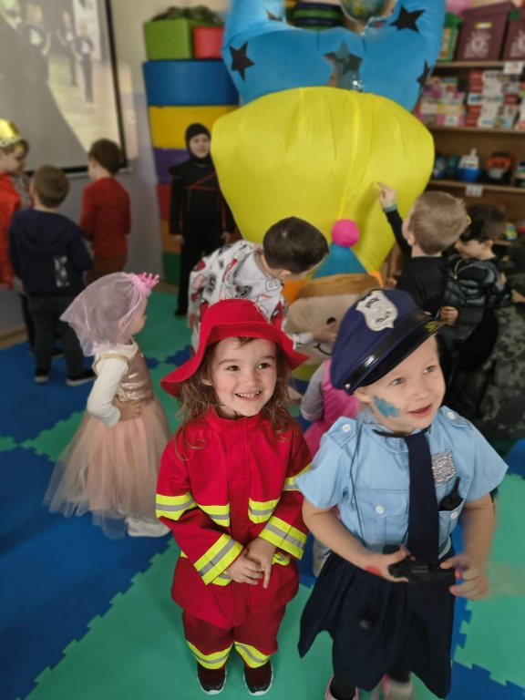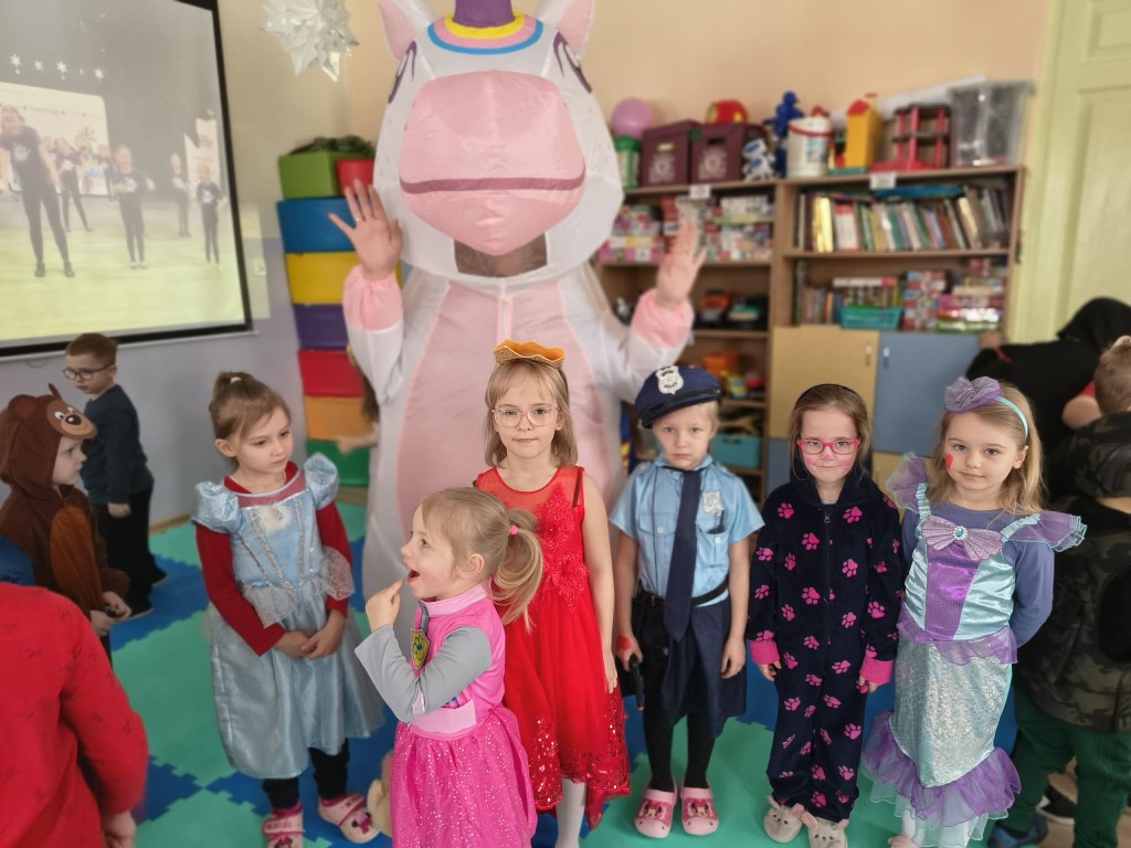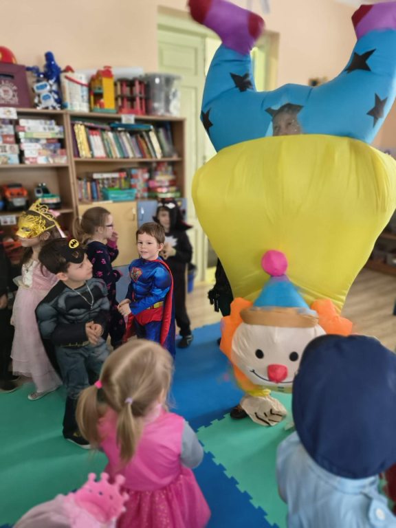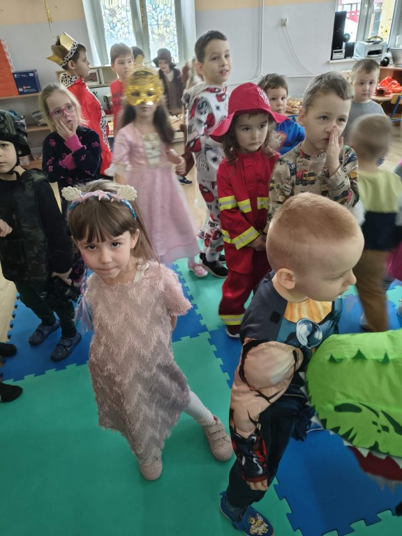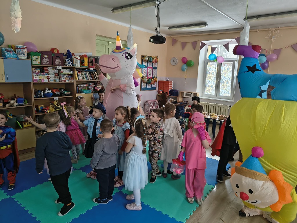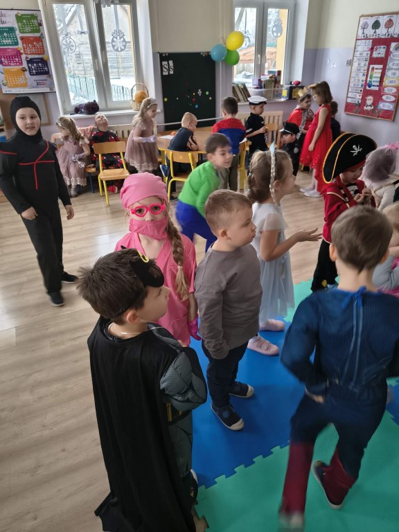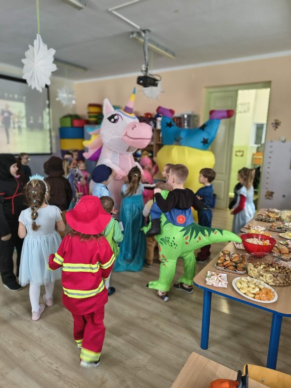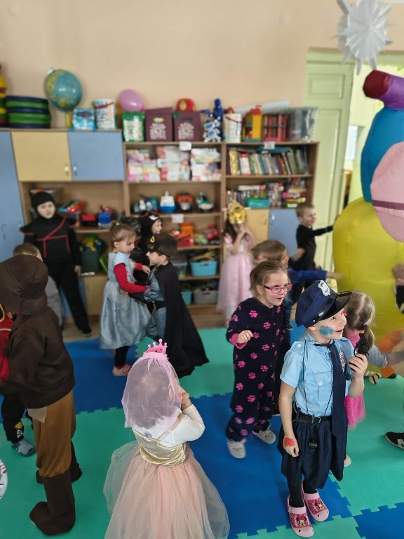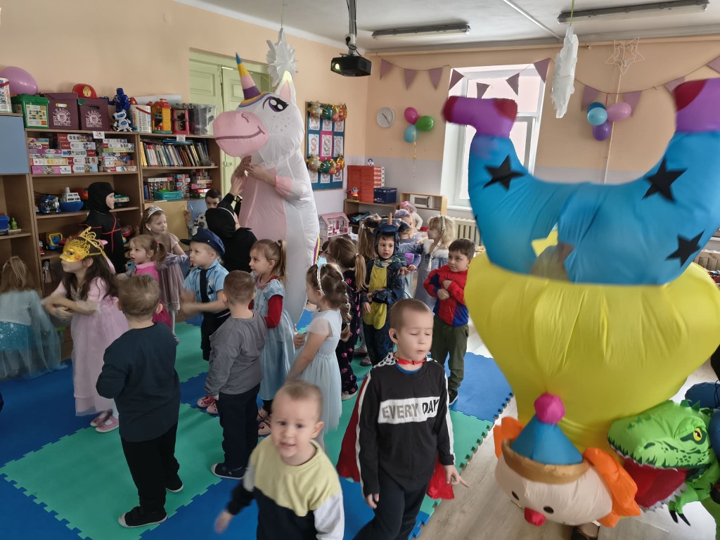 Sala zamieniła się w prawdziwą krainę radości, kolorów i fantastycznych postaci. Dzieci zachwycały pięknymi, kreatywnymi strojami – nie brakowało księżniczek, superbohaterów, zwierzątek i bajkowych bohaterów.