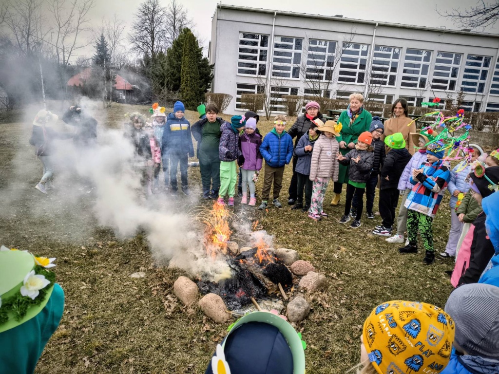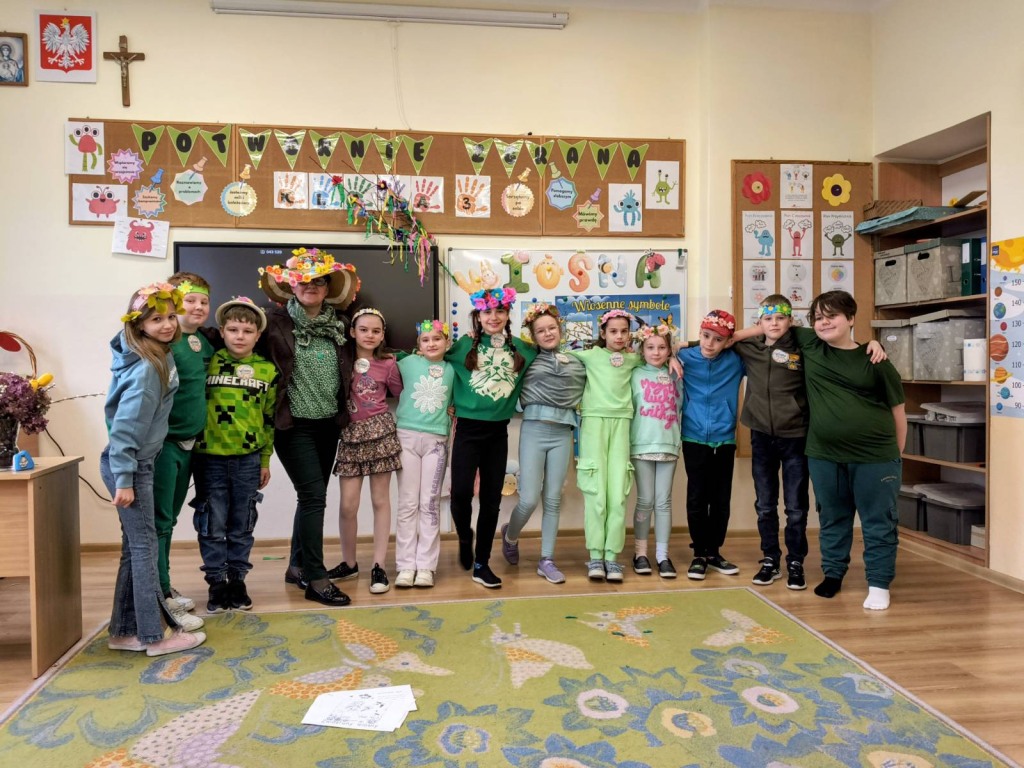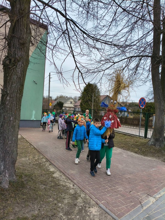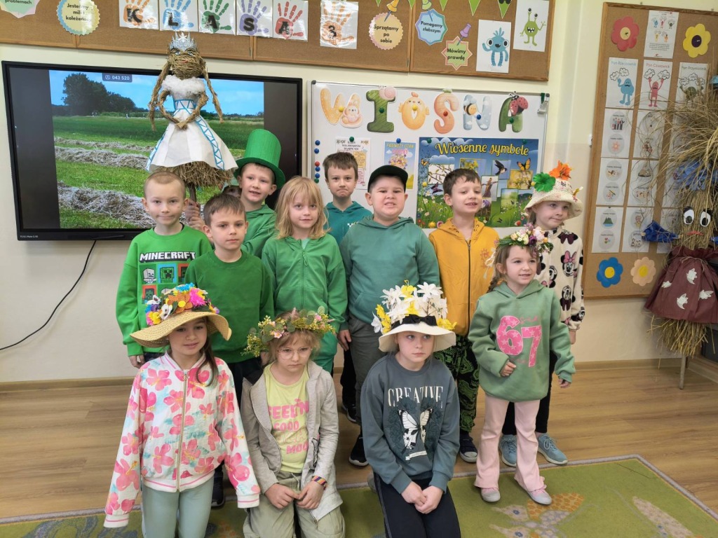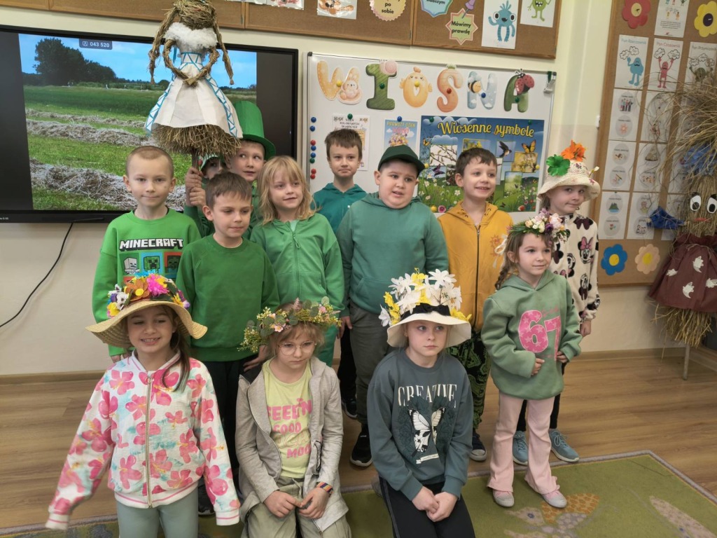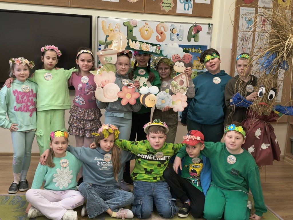 20 marca 2026r. Dzieci z kl.1-3 obchodziły uroczyste powitanie wiosny. Uczniowie przebrali się w zielone stroje, wszyscy przygotowali wiosenne nakrycia głowy. Dzień rozpoczęliśmy od spalenia Marzanny – zimowej panny.