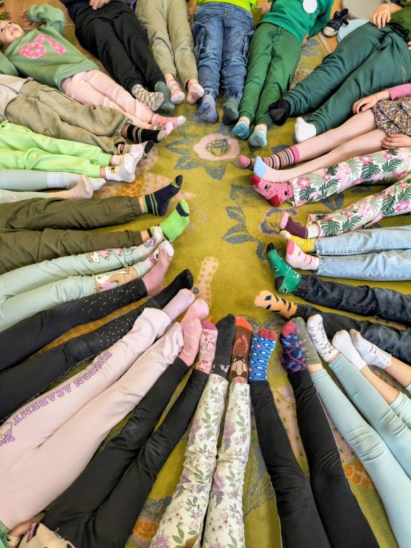 Następnie każda klasa zaprezentowała przygotowaną przez siebie wiosenną piosenkę. Przygotowaliśmy też plakaty i pamiętaliśmy, że tego dnia obchodzony jest Światowy Dzień Zespołu Downa – Dzień Kolorowej skarpetki. Był to bardzo zielony i radosny dzień.![]()