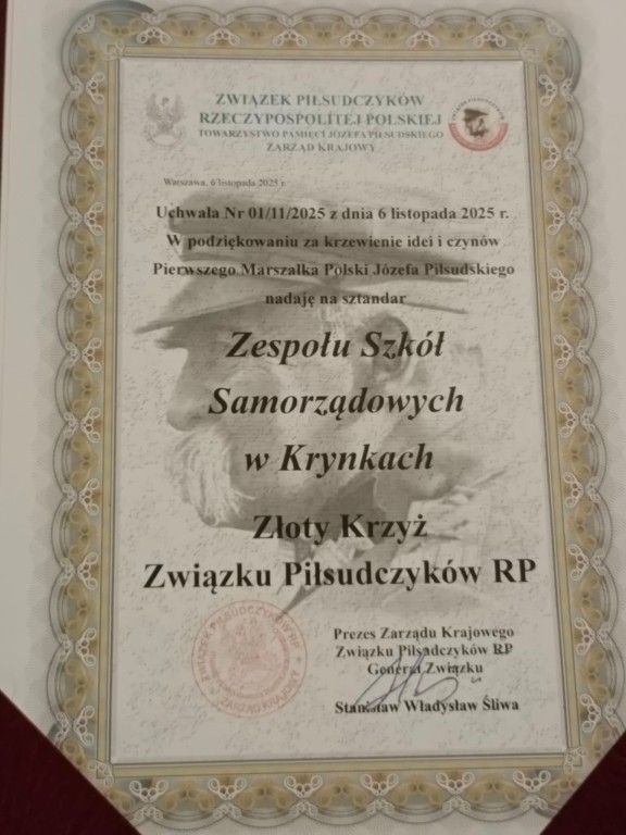Podczas apelu miało miejsce wyjątkowe wydarzenie – uhonorowanie sztandaru naszej szkoły Złotym Krzyżem Związku Piłsudczyków Rzeczypospolitej Polskiej za krzewienie idei i czynów Pierwszego Marszałka Polski Józefa Piłsudskiego. To wyróżnienie jest dla całej społeczności szkolnej wielkim zaszczytem i zobowiązaniem do dalszego wychowywania młodych pokoleń w duchu miłości do Ojczyzny, wolności i odpowiedzialności za Polskę.